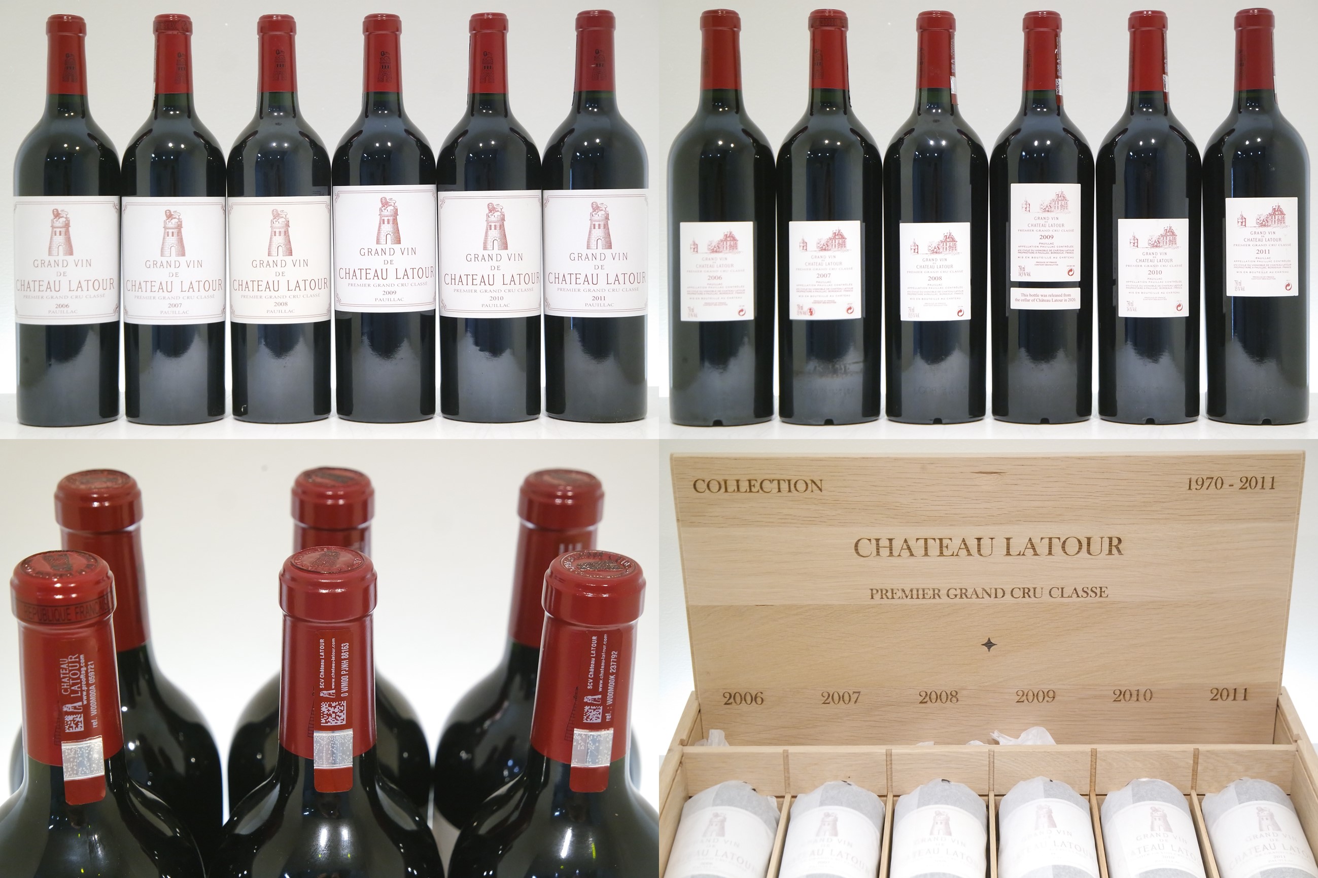 Pre-Arrival ETA: Dec 2024-Jan 2025 Chateau Latour 42-Year Vertical (1970 - 2011) @ $57,995 Packed in 7 x 6-pack wood cases, vintage engraved. Includes 1 bottle of each vintage from 1970 through 2011. Older vintages show top shoulder fill levels and some mild label fading.